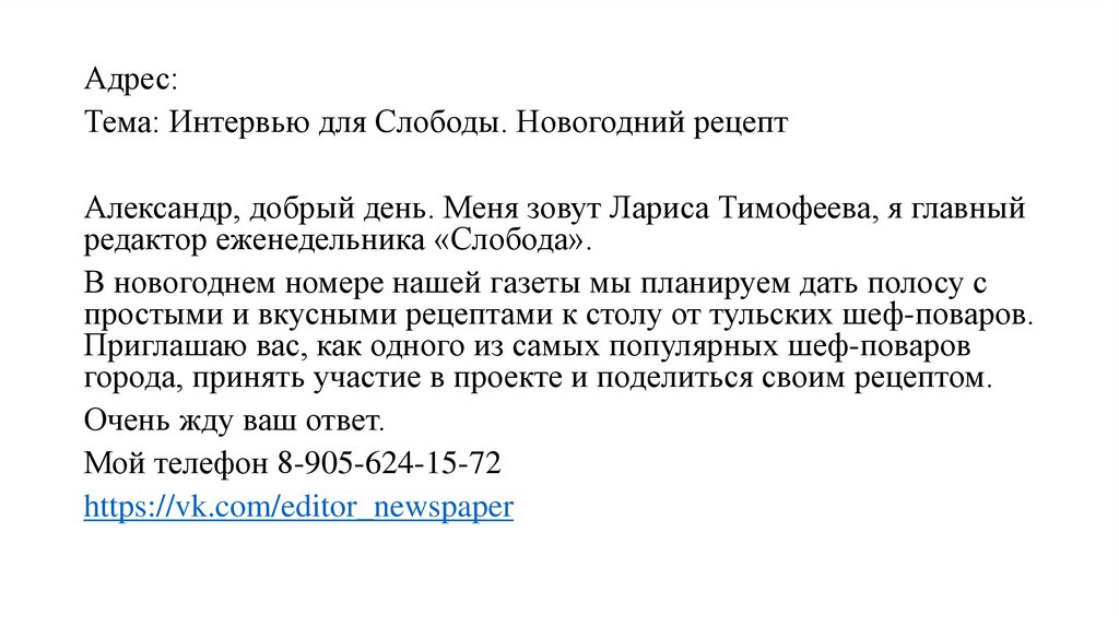 Адрес:Тема: Интервью для Слободы. Новогодний рецепт