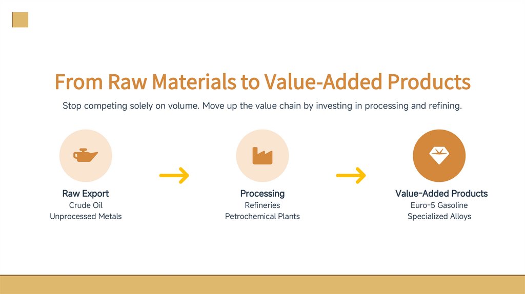From Raw Materials to Value-Added ProductsStop competing solely on volume. Move up the value chain by investing in processing and refining.