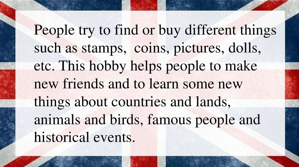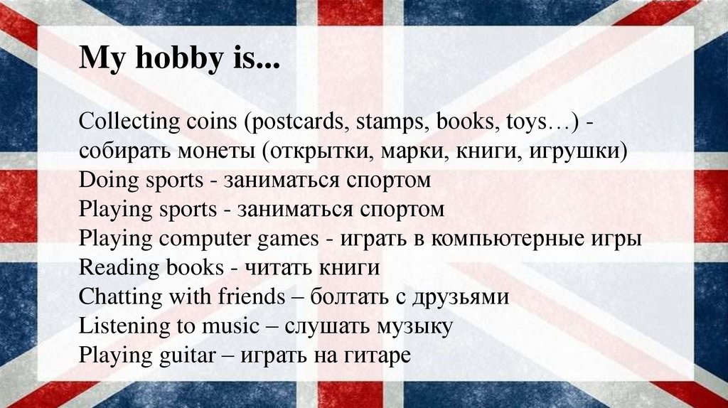My hobby is...Collecting coins (postcards, stamps, books, toys…) собирать монеты (открытки, марки, книги, игрушки)