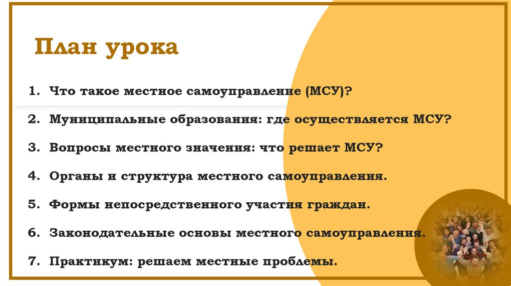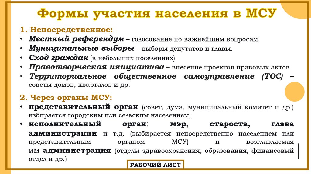 1. Что такое местное самоуправление (МСУ)?2. Муниципальные образования: где осуществляется МСУ?