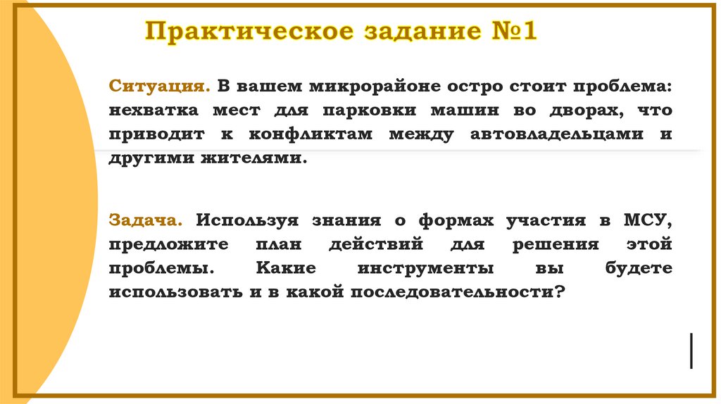 Ситуация. В вашем микрорайоне остро стоит проблема:нехватка мест для парковки машин во дворах, что