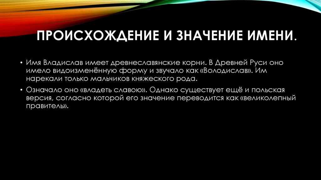 ПРОИСХОЖДЕНИЕ И ЗНАЧЕНИЕ ИМЕНИ.• Имя Владислав имеет древнеславянские корни. В Древней Руси оно