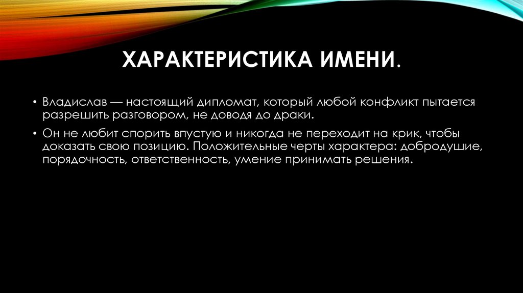 ХАРАКТЕРИСТИКА ИМЕНИ.• Владислав — настоящий дипломат, который любой конфликт пытается
