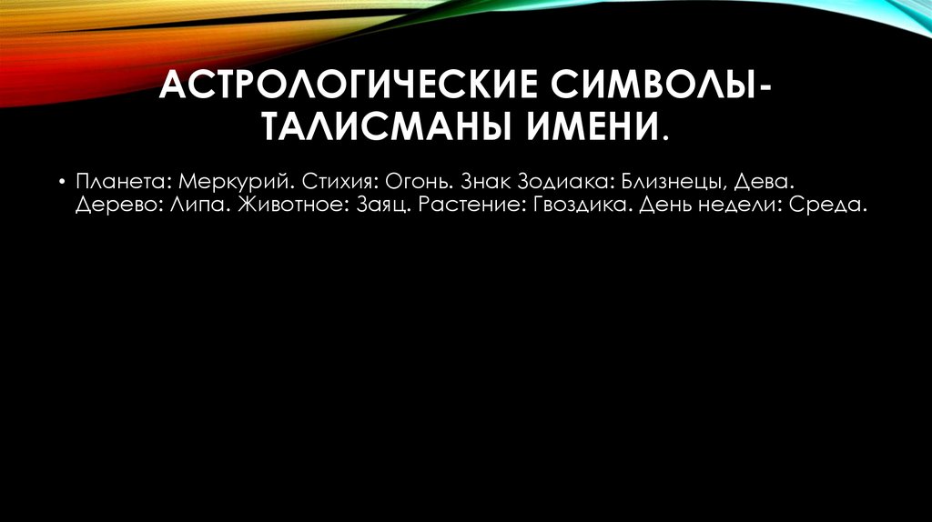 АСТРОЛОГИЧЕСКИЕ СИМВОЛЫТАЛИСМАНЫ ИМЕНИ.• Планета: Меркурий. Стихия: Огонь. Знак Зодиака: Близнецы, Дева.