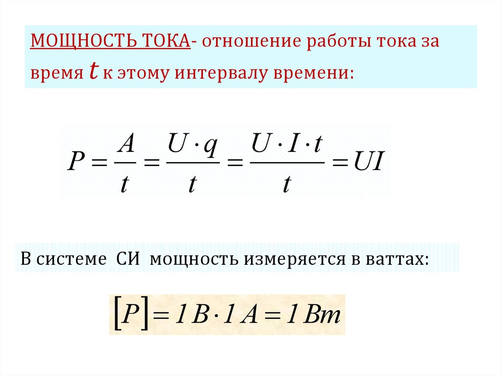 МОЩНОСТЬ ТОКА- отношение работы тока завремя t к этому интервалу времени: