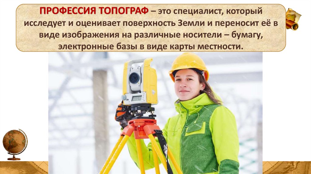 ПРОФЕССИЯ ТОПОГРАФ – это специалист, которыйисследует и оценивает поверхность Земли и переносит её в