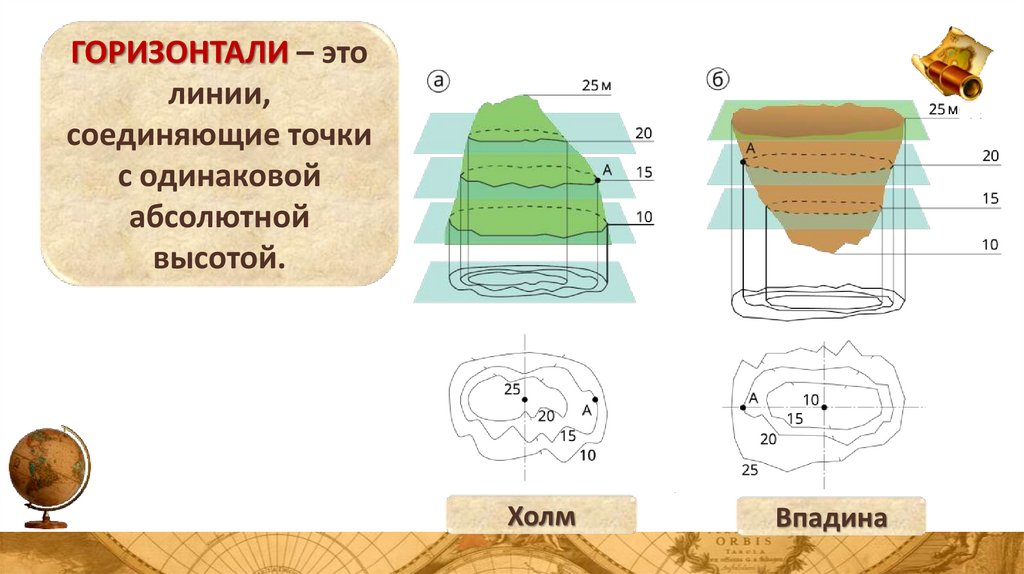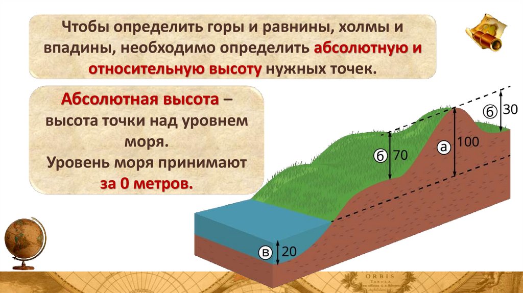Чтобы определить горы и равнины, холмы ивпадины, необходимо определить абсолютную и