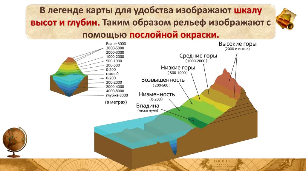 В легенде карты для удобства изображают шкалувысот и глубин. Таким образом рельеф изображают с
