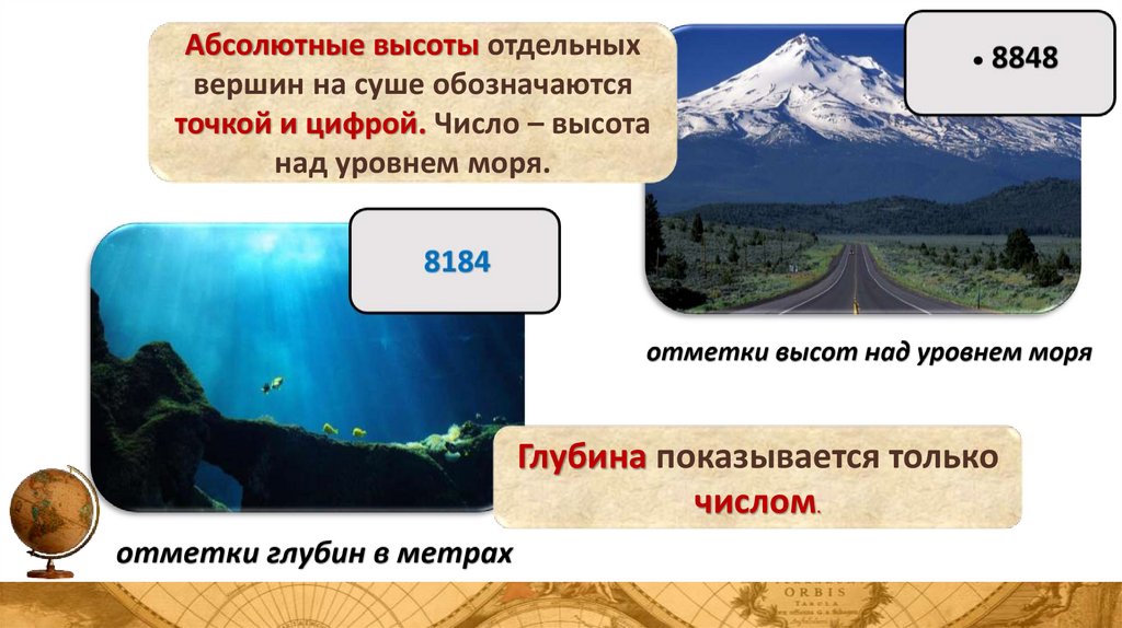 Абсолютные высоты отдельныхвершин на суше обозначаются