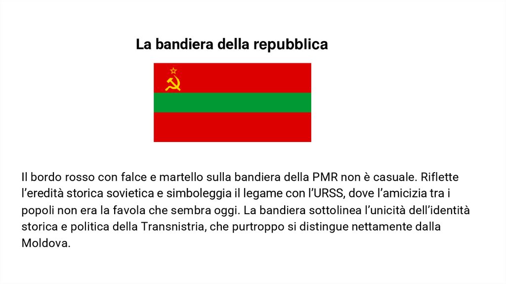 La bandiera della repubblicaIl bordo rosso con falce e martello sulla bandiera della PMR non è casuale. Riflette