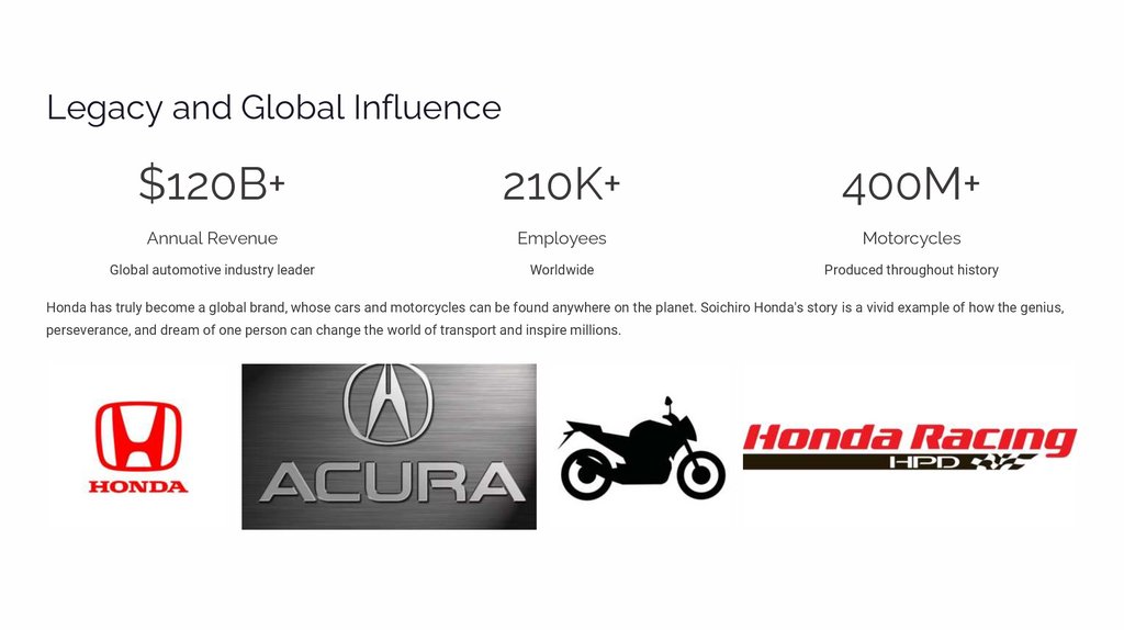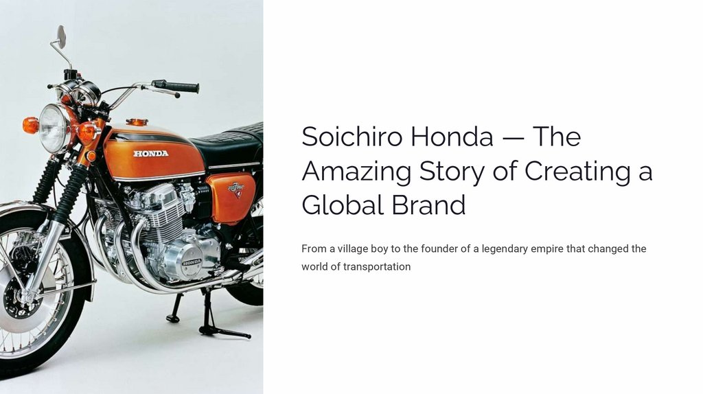 Honda has truly become a global brand, whose cars and motorcycles can be found anywhere on the planet. Soichiro Honda's story is a vivid example of how the genius,