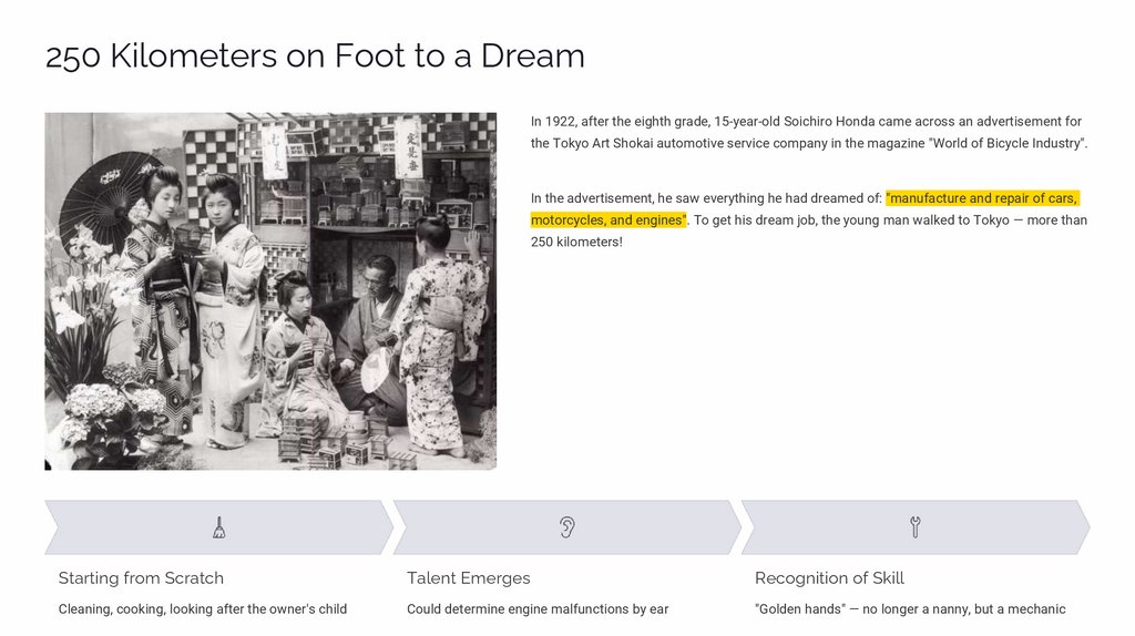 motorcycles, and engines". To get his dream job, the young man walked to Tokyo — more than