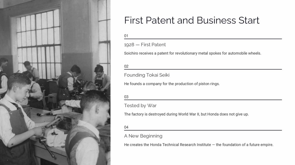 Soichiro receives a patent for revolutionary metal spokes for automobile wheels.