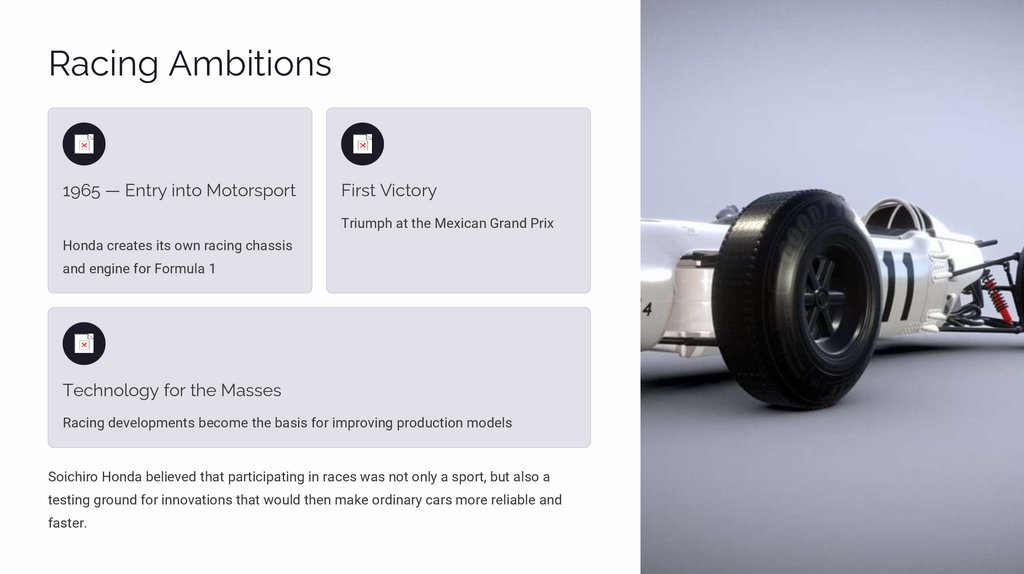 Soichiro Honda believed that participating in races was not only a sport, but also a