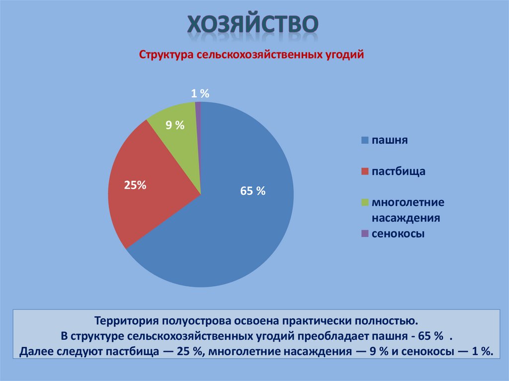 В структуре сельскохозяйственных угодий преобладает пашня - 65 % .