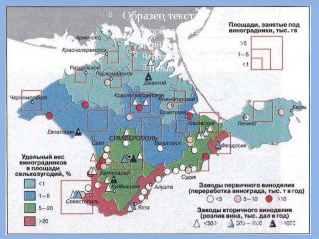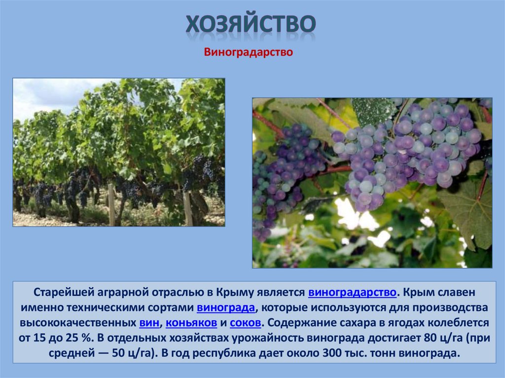 ВиноградарствоСтарейшей аграрной отраслью в Крыму является виноградарство. Крым славен