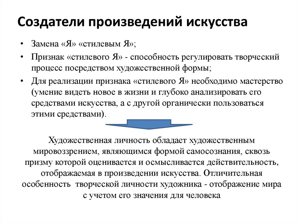 • Замена «Я» «стилевым Я»;• Признак «стилевого Я» - способность регулировать творческий