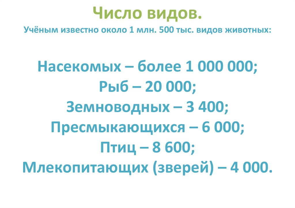 Число видов.Учёным известно около 1 млн. 500 тыс. видов животных: