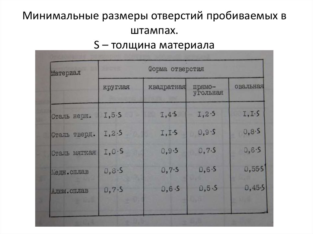 Минимальные размеры отверстий пробиваемых в штампах. S – толщина материала