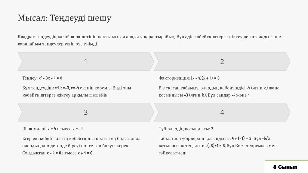 Мысал: Теңдеуді шешуКвадрат теңдеудің қалай шешілетінін нақты мысал арқылы қарастырайық. Бұл әдіс көбейткіштерге жіктеу деп аталады және