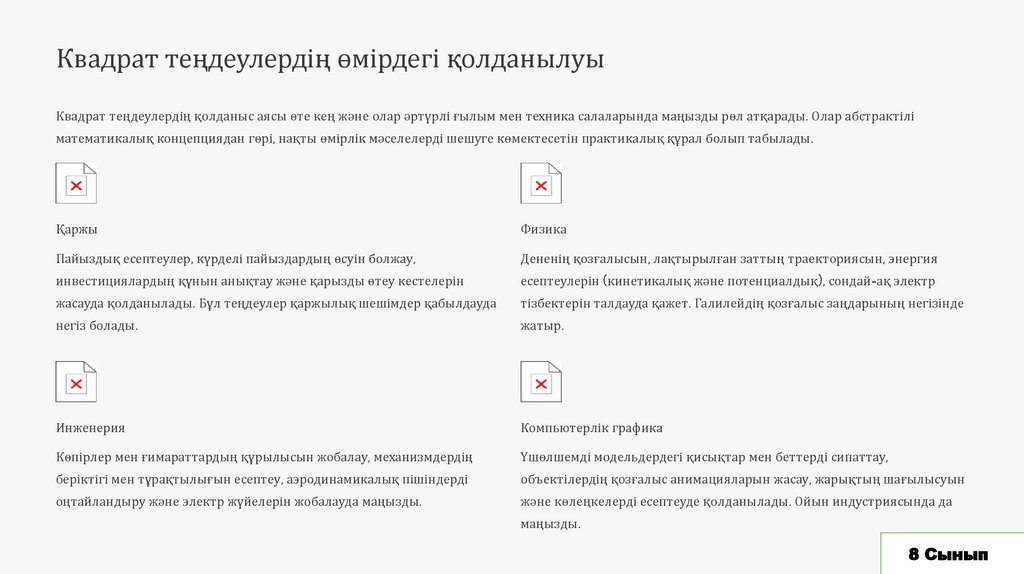 Квадрат теңдеулердің өмірдегі қолданылуыКвадрат теңдеулердің қолданыс аясы өте кең және олар әртүрлі ғылым мен техника салаларында маңызды рөл атқарады. Олар абстрактілі
