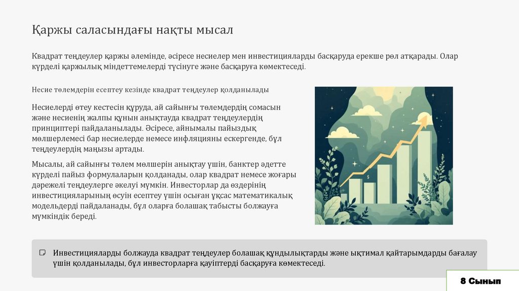 Қаржы саласындағы нақты мысалКвадрат теңдеулер қаржы әлемінде, әсіресе несиелер мен инвестицияларды басқаруда ерекше рөл атқарады. Олар