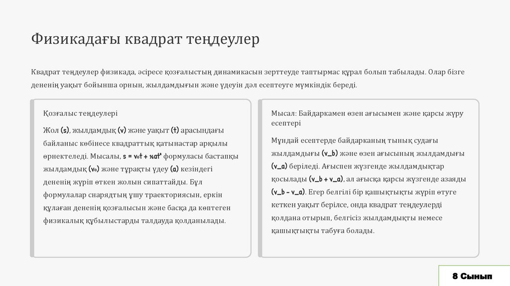 Физикадағы квадрат теңдеулерКвадрат теңдеулер физикада, әсіресе қозғалыстың динамикасын зерттеуде таптырмас құрал болып табылады. Олар бізге