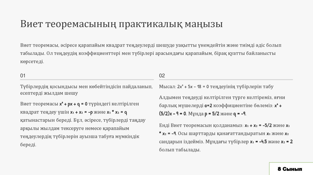 Виет теоремасының практикалық маңызыВиет теоремасы, әсіресе қарапайым квадрат теңдеулерді шешуде уақытты үнемдейтін және тиімді әдіс болып