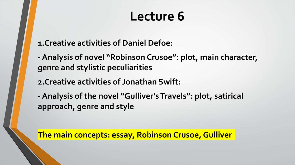 The main concepts: essay, Robinson Crusoe, Gulliver