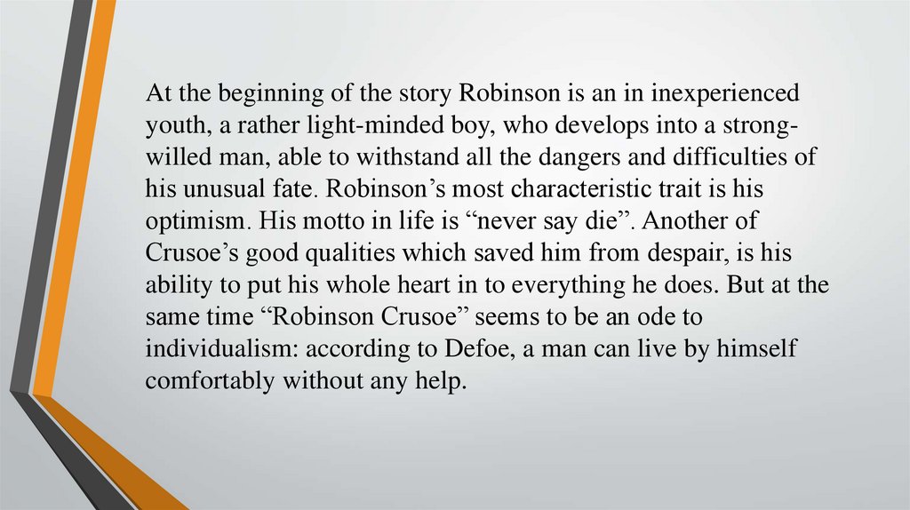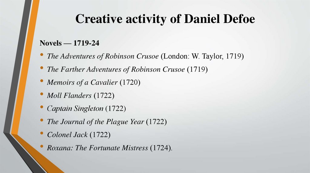 1.Creative activities of Daniel Defoe:- Analysis of novel “Robinson Crusoe”: plot, main character,