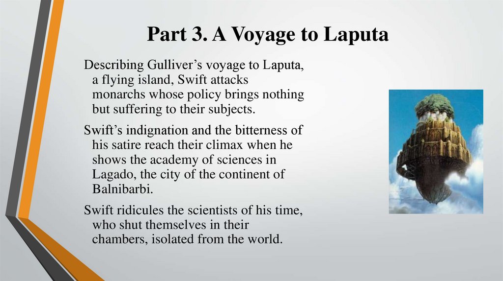 Describing Gulliver’s voyage to Laputa,a flying island, Swift attacks