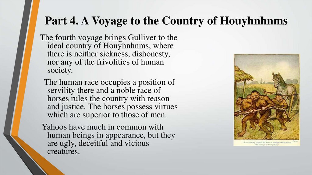 The fourth voyage brings Gulliver to theideal country of Houyhnhnms, where