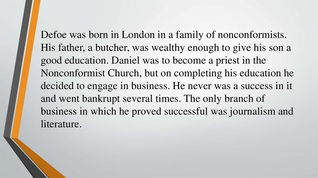 Defoe was born in London in a family of nonconformists.His father, a butcher, was wealthy enough to give his son a