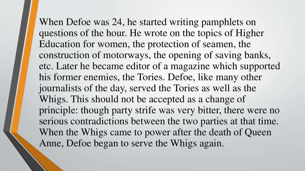 When Defoe was 24, he started writing pamphlets onquestions of the hour. He wrote on the topics of Higher