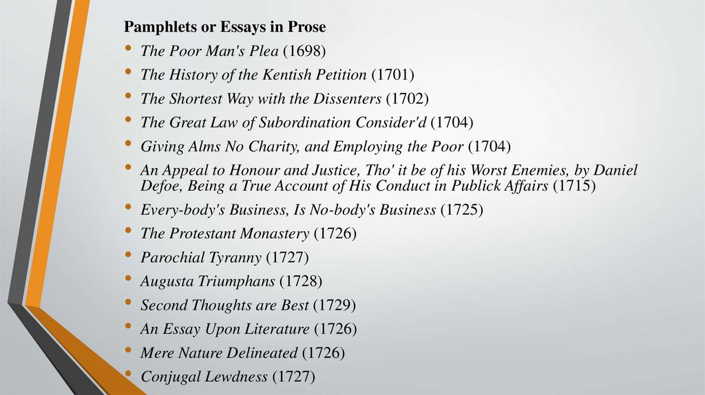 Pamphlets or Essays in Verse• The True-Born Englishman: A Satyr (1701) — a defense of William III.