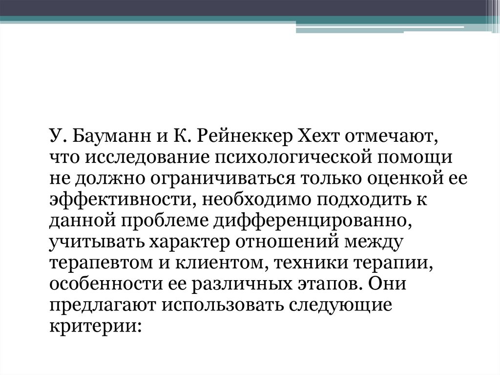 У. Бауманн и К. Рейнеккер Хехт отмечают,что исследование психологической помощи