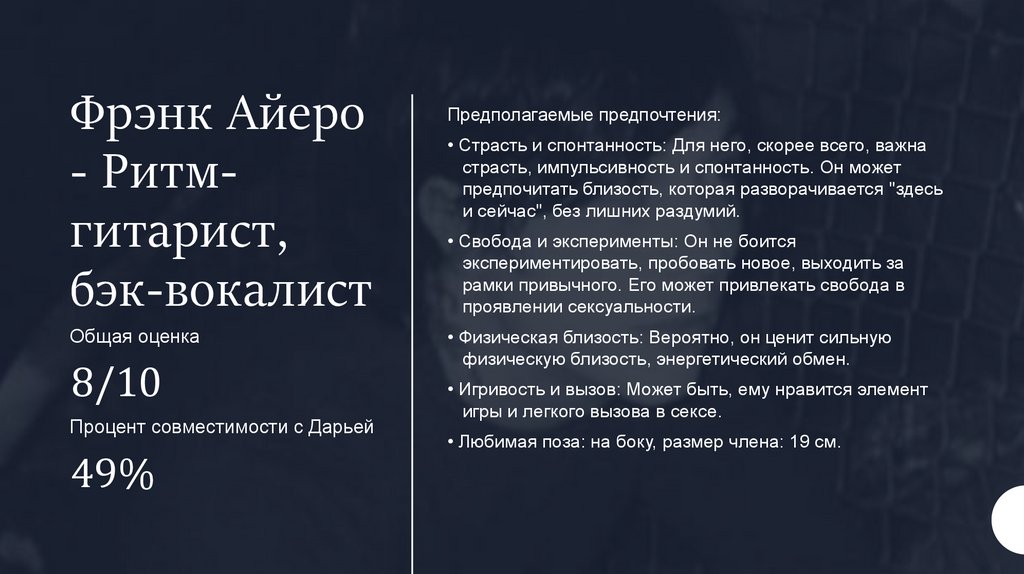 • Динамика: Может ценить динамику в сексе, смену темпа