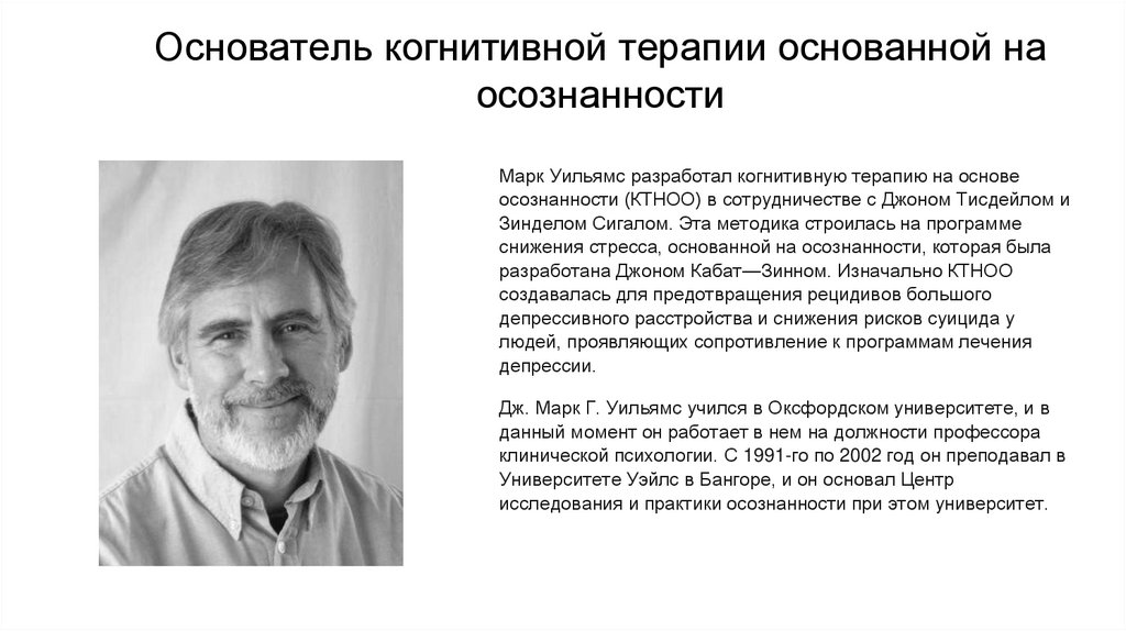 Марк Уильямс разработал когнитивную терапию на основеосознанности (КТНОО) в сотрудничестве с Джоном Тисдейлом и
