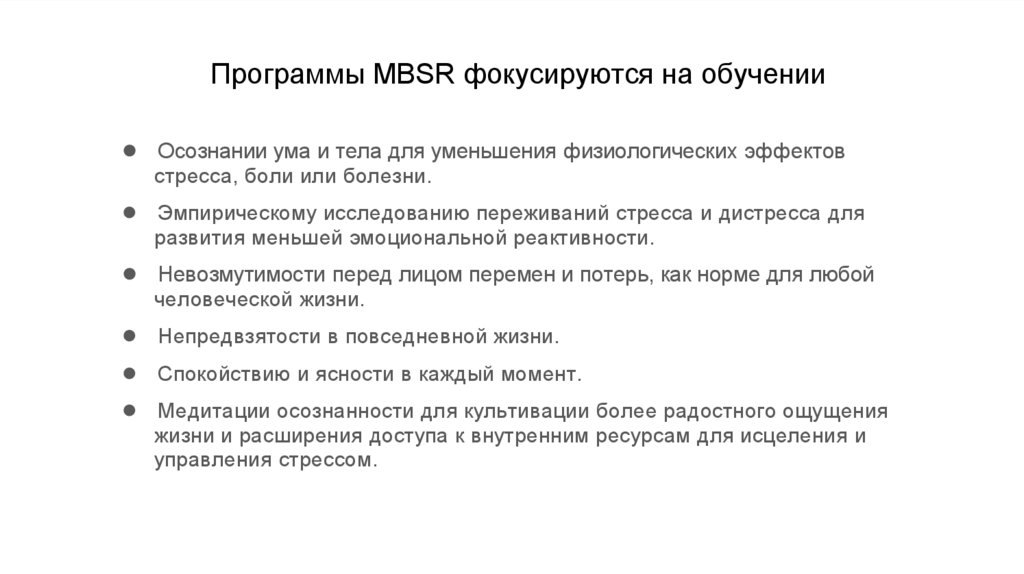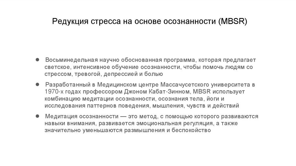 ● Восьминедельная научно обоснованная программа, которая предлагаетсветское, интенсивное обучение осознанности, чтобы помочь людям со