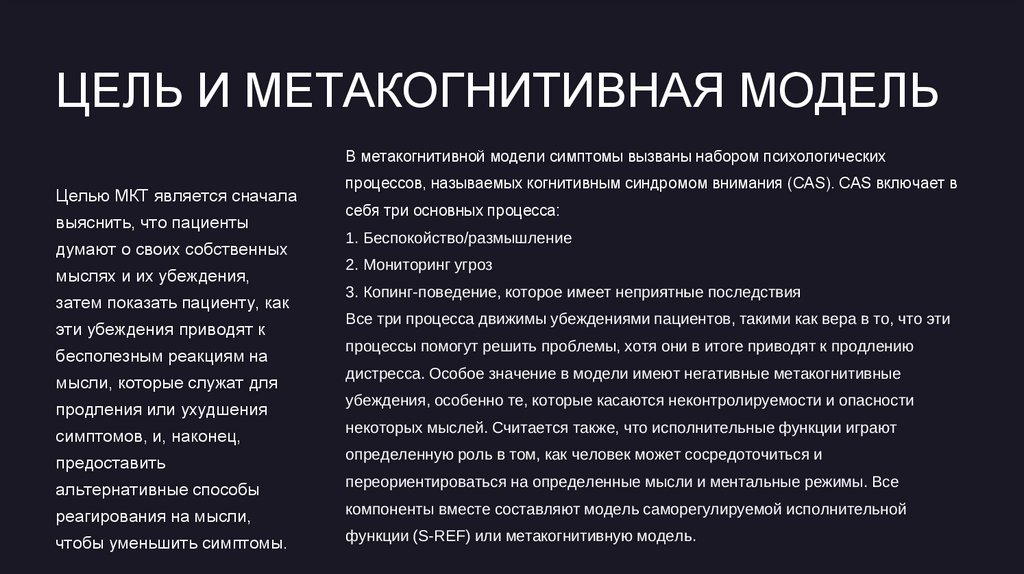 ЦЕЛЬ И МЕТАКОГНИТИВНАЯ МОДЕЛЬВ метакогнитивной модели симптомы вызваны набором психологических