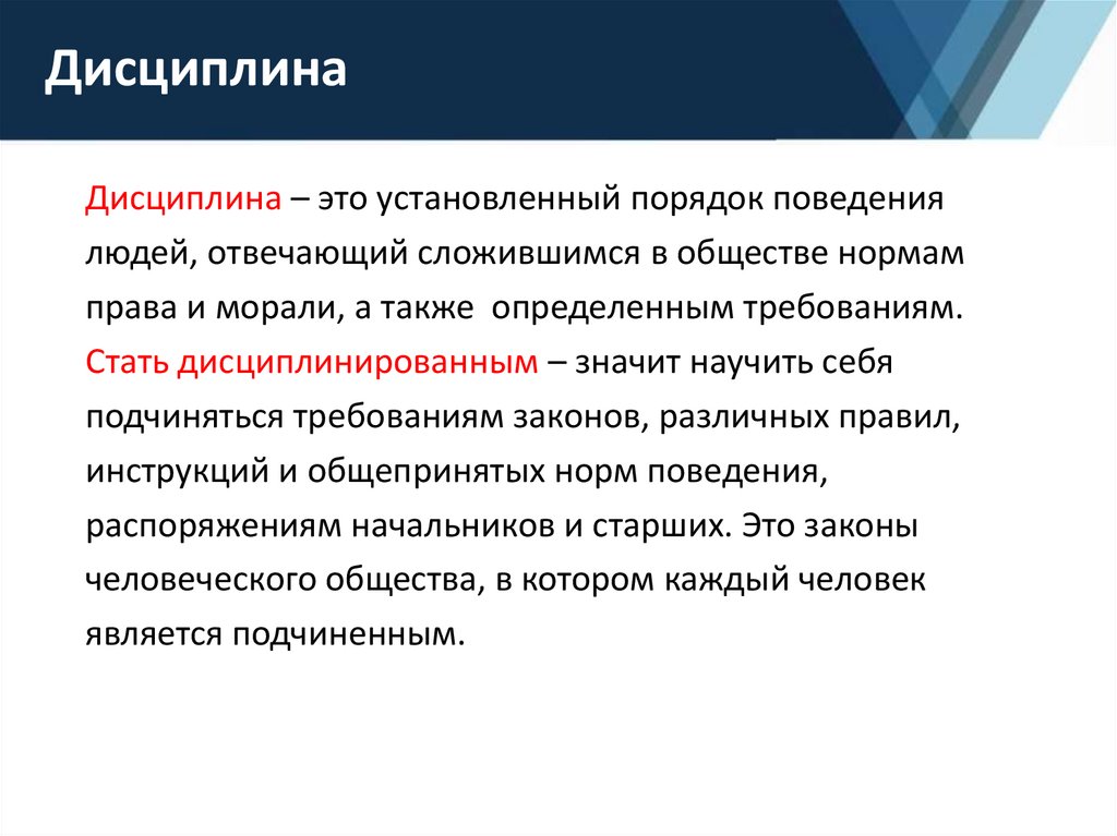 Дисциплина – это установленный порядок поведениялюдей, отвечающий сложившимся в обществе нормам