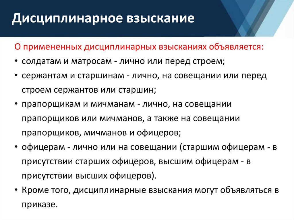 О примененных дисциплинарных взысканиях объявляется:• солдатам и матросам - лично или перед строем;