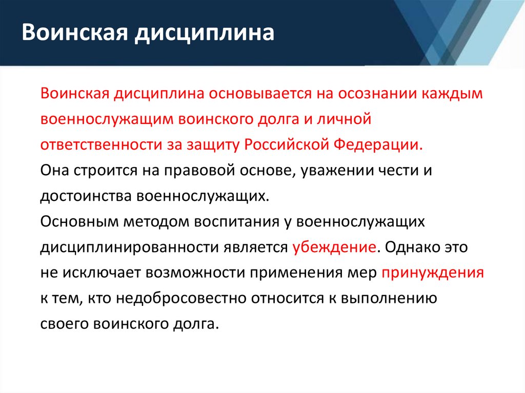 Воинская дисциплина основывается на осознании каждымвоеннослужащим воинского долга и личной