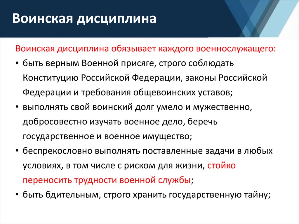 Воинская дисциплина обязывает каждого военнослужащего:• быть верным Военной присяге, строго соблюдать