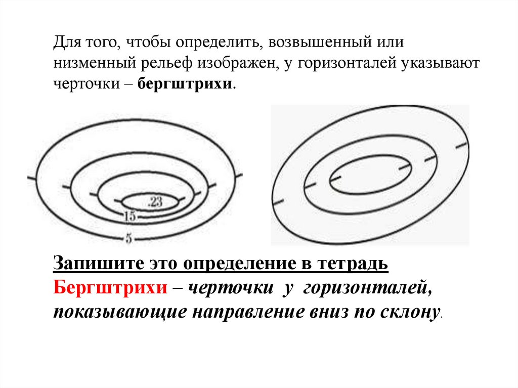 Для того, чтобы определить, возвышенный илинизменный рельеф изображен, у горизонталей указывают