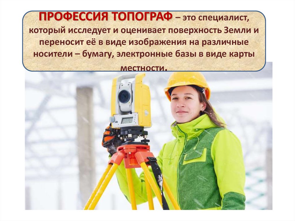 ПРОФЕССИЯ ТОПОГРАФ – это специалист,который исследует и оценивает поверхность Земли и