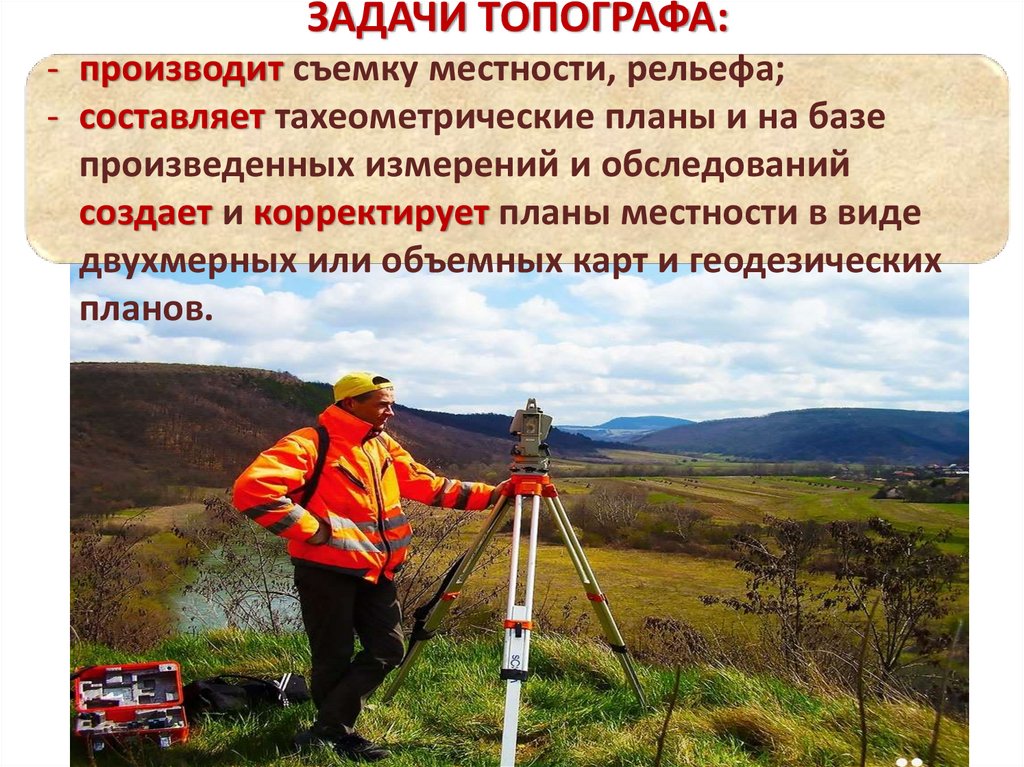 ЗАДАЧИ ТОПОГРАФА:- производит съемку местности, рельефа;