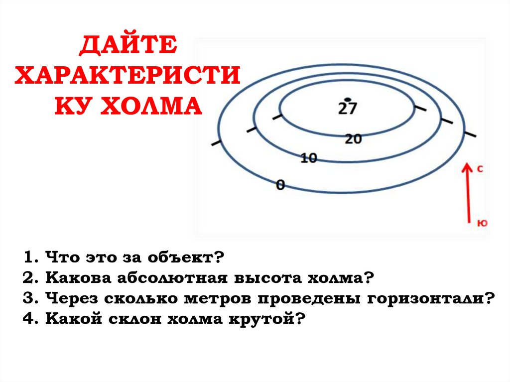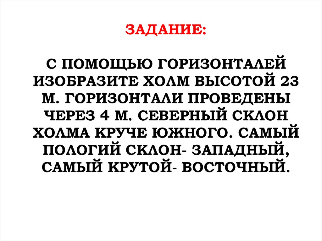 27. ЗАДАНИЕ: С помощью горизонталей изобразите холм высотой 23 м. Горизонтали проведены через 4 м. Северный склон холма круче