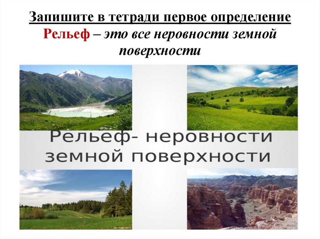 9. Запишите в тетради первое определение Рельеф – это все неровности земной поверхности
