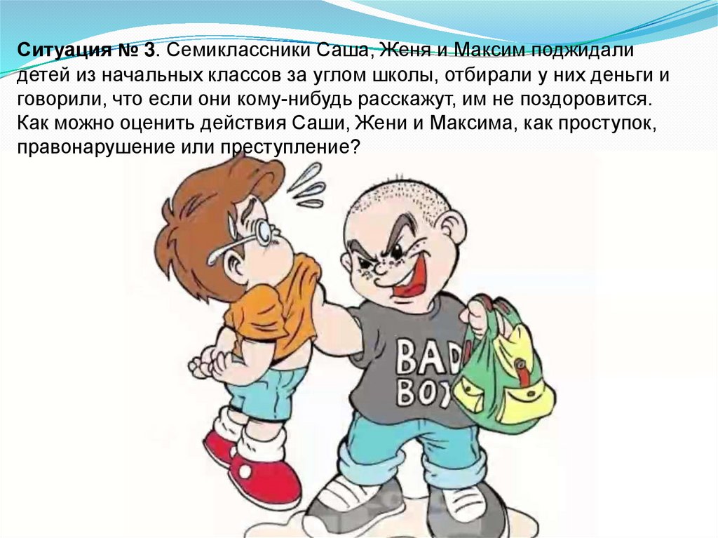 Ситуация № 3. Семиклассники Саша, Женя и Максим поджидалидетей из начальных классов за углом школы, отбирали у них деньги и